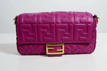 Realizzata in pelle di vitello di colore fucsia, particolarmente morbida e resistente, con iconico motivo FF a rilievo dall'effetto tridimensionale. Decorata con chiusura FF.